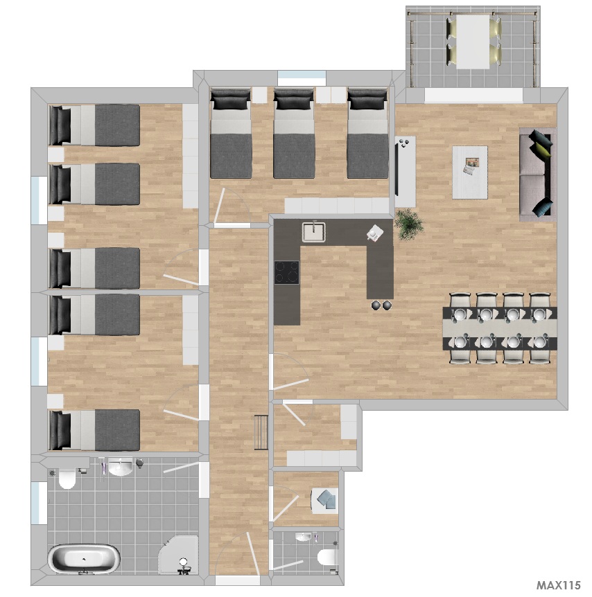with eight single beds and an additionally sleeping sofa. The apartment is good for up to nine people.